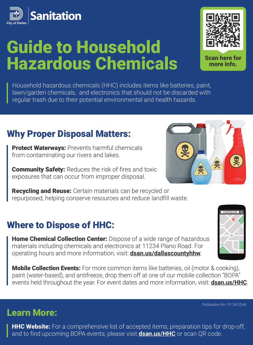 The City of Dallas Sanitation Department offers easy and safe disposal options for these household hazardous chemicals (HHC):